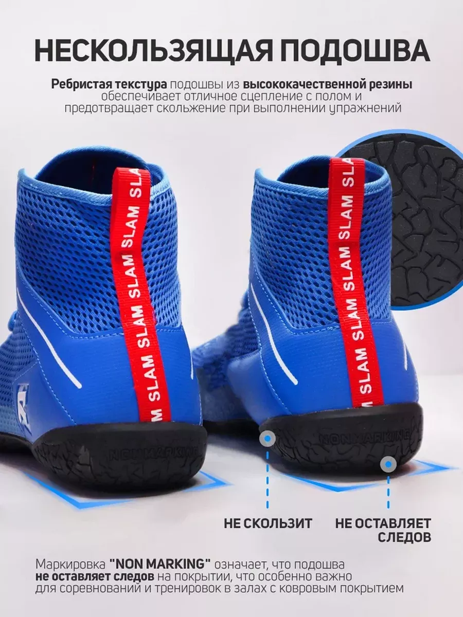 Подошва борцовок изготовлена из высококачественной резины, что обеспечивает отличное сцепление с полом и предотвращает скольжение при выполнении упражнений. Маркировка “Non Marking” на подошве означает, что обувь не оставляет следов на покрытии, что особенно важно для соревнований и тренировок в залах с ковровым покрытием.
