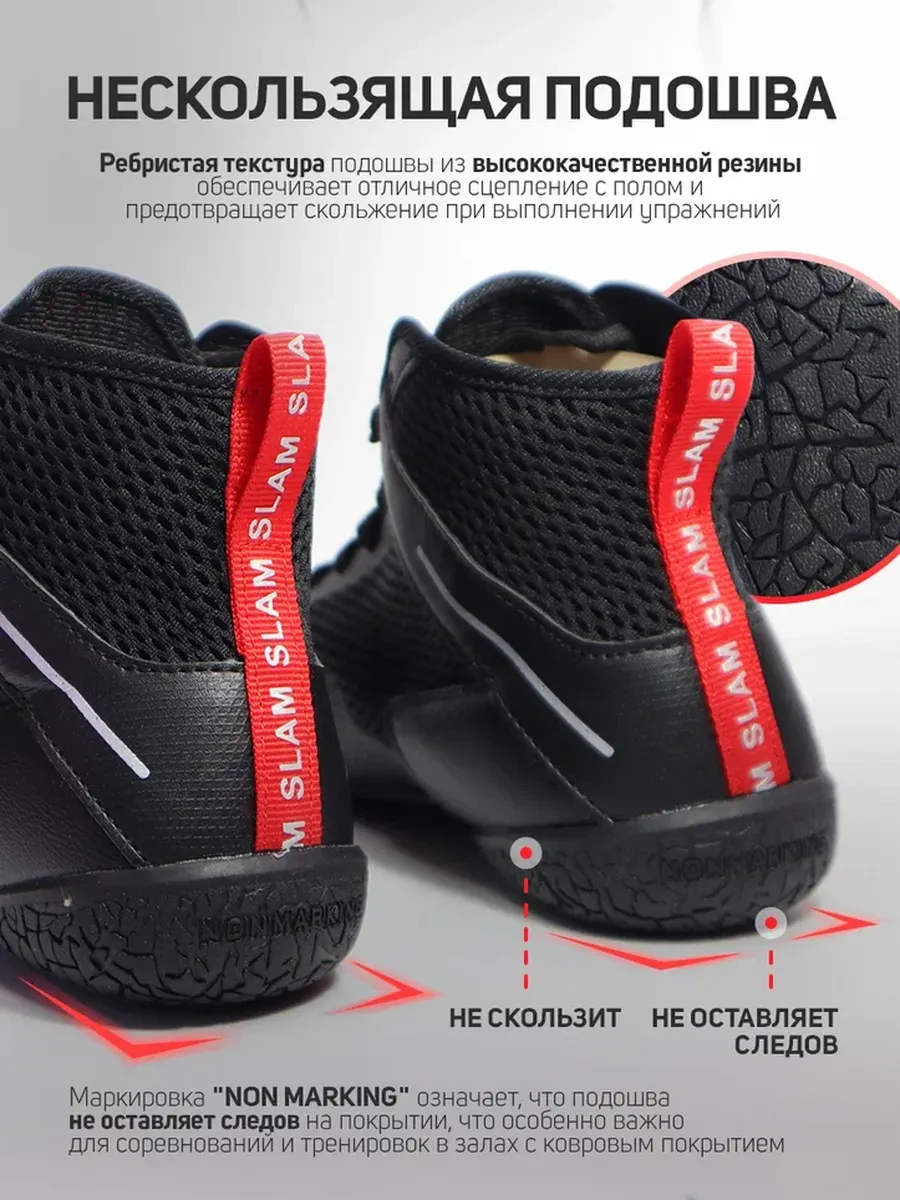 Подошва борцовок изготовлена из высококачественной резины, что обеспечивает отличное сцепление с полом и предотвращает скольжение при выполнении упражнений. Маркировка “Non Marking” на подошве означает, что обувь не оставляет следов на покрытии, что особенно важно для соревнований и тренировок в залах с ковровым покрытием.