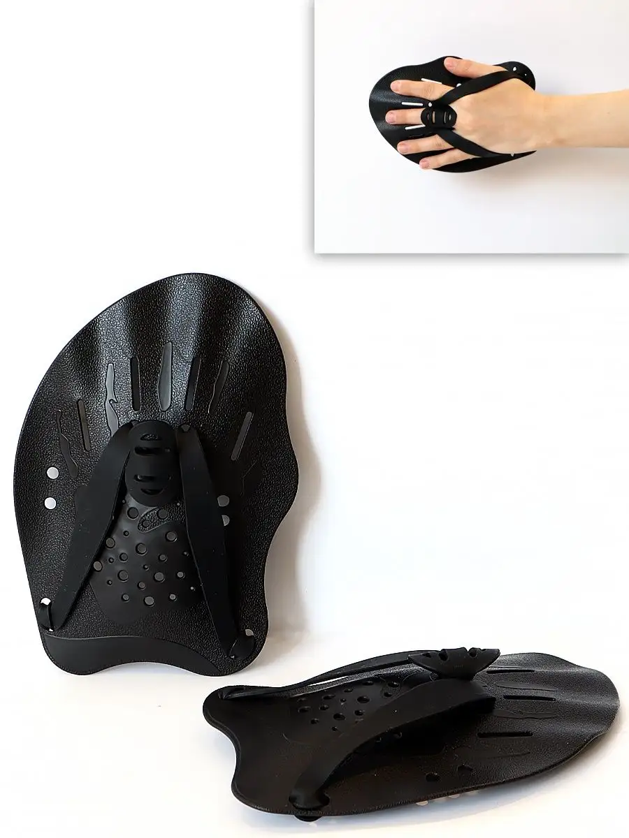 Это аксессуар, который помогает улучшить и обучиться правильной технике гребка, развить силу мышц. За счет более высокого сопротивления воды пловец учится отрабатывать правильную технику и вкладывать руку в воду, т.к. из-за большой площади ладони проще всего положить руку под верным углом, а затем провести ее вдоль корпуса. Очень удобны из-за повторения формы ладони, имеют необходимые отверстия для улучшения ощущения воды. Изготовлены из плотного пластика, оснащены регулируемыми силиконовыми резинками на палец и запястье, благодаря которым можно регулировать захват.