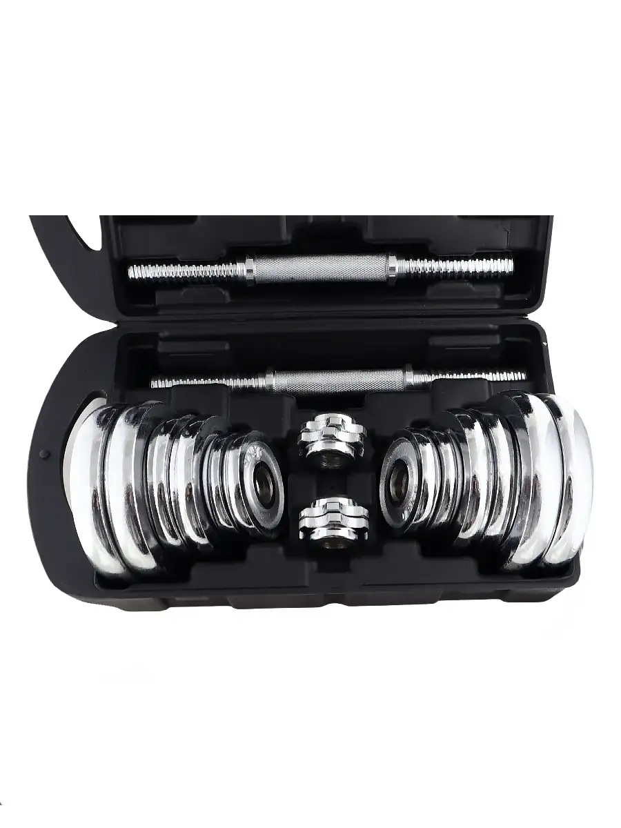 кейс-1шт, гриф-2шт, замки-4шт, диск 2,5кг-4шт, диск 1,25кг-4шт, диск 0,5кг-4шт