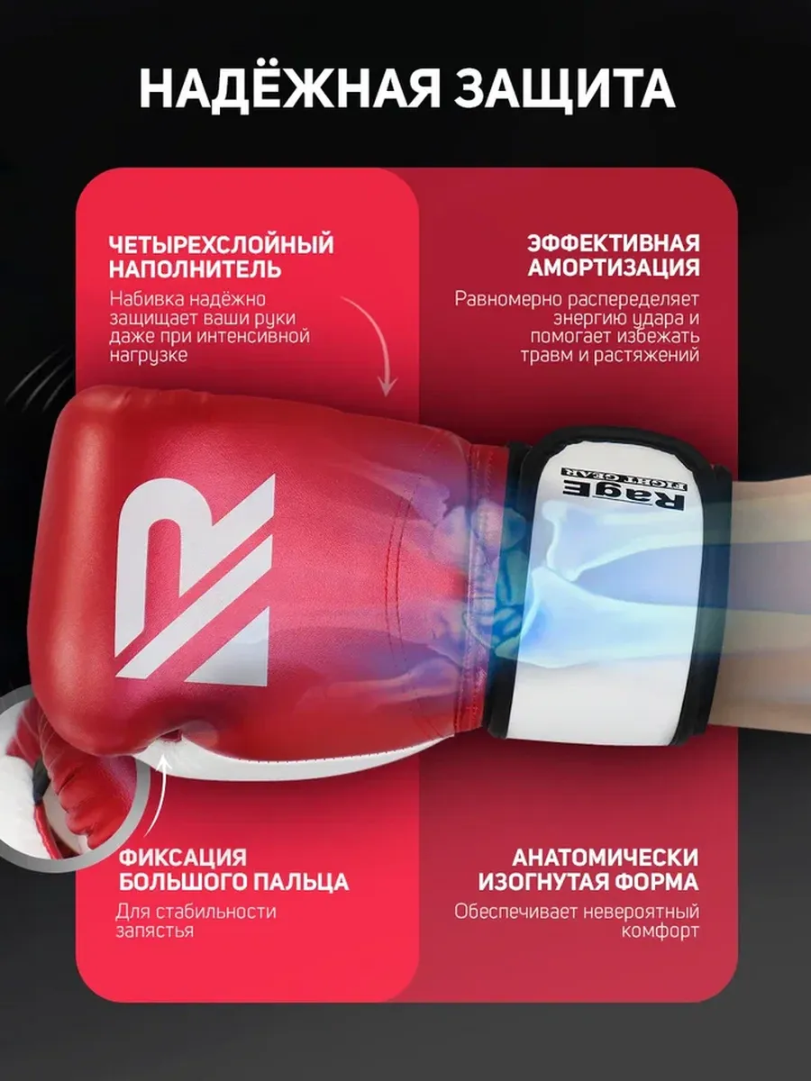 Боксерские перчатки Rage сделаны из износостойкого материала - искусственной кожи PU (полиуретан). Четырехслойный наполнитель. Перчатки для бокса- удобная посадка, фиксация большого пальца делают тренировки максимально комфортными. Широкая липучка обеспечивает поддержку запястья. Спортивные перчатки имеют вкладыш из пенополиуретана , благодаря использованию ударопоглощающих материалов , набивка обеспечивает наиболее гуманное гашение энергии удара в широком диапазоне нагрузок. Тренировочные боксерские перчатки - это отличный вариант для начинающих спортсменов и любителей ударных единоборств. Особенностью качественных профессиональных перчаток является их удобная, анатомически изогнутая форма, обеспечивающая оптимальный комфорт. Вы будете довольны соотношением цены и качества.