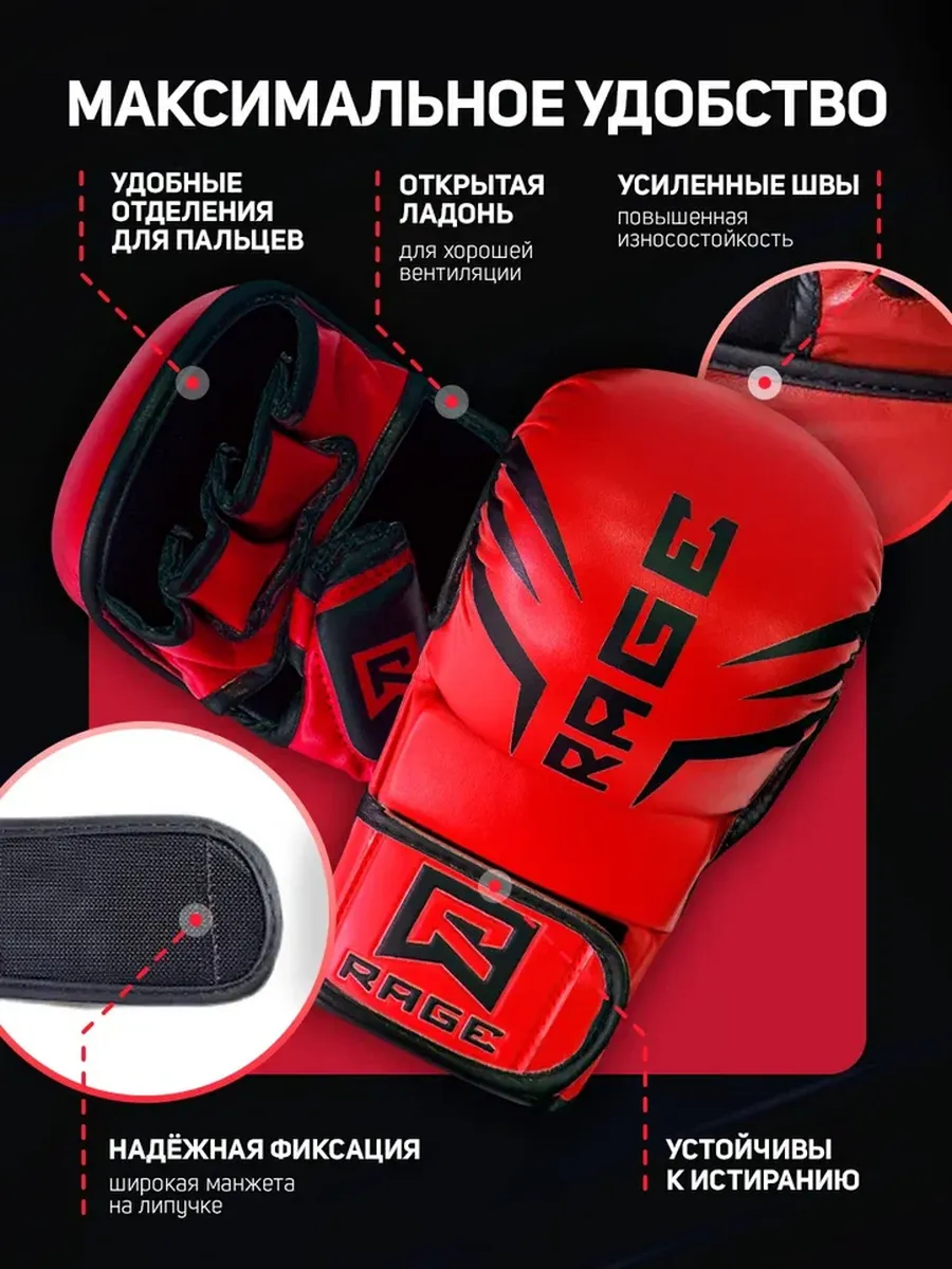 Перчатки крабы для мма из искусственной кожи Rage fight gear. Полная защита кисти от травм. Перчатки обеспечивают свободу для захватов и бросков. Благодаря продуманной конструкции перчатки не сковывают кисти рук. Открытые первые фаланги сохраняют тактильные ощущения при выполнении захватов и блокировок. Эластичная набивка большого пальца обеспечивает свободу движений. Широкие манжеты на липучке надежно фиксируют запястье. Внутренняя часть из неопрена помогает отводить влагу, что гарантирует комфорт во время боя.