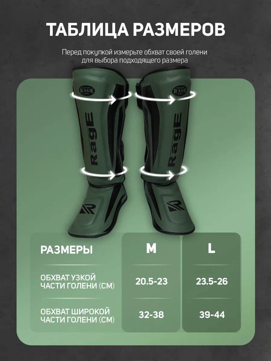 Защита голени Rage - это отличный выбор для спортсменов любого уровня, подходит как для новичков, так и для профессиональных спортсменов. Крепления с липучками и эластичными лентами обеспечивают надежную подгонку. Внутренним наполнителем у щитков для мма является пена, которая поглощает силу удара и позволяет избежать травмы во время спарринга, а внешний материал - это плотная искусственная кожа с высокой стойкостью к истиранию, обеспечивающая надежную защиту голени и стопы. отлично подойдет для занятий ММА, тайский бокс, карате и кудо, и другими видами единоборств. Щитки Размер M (обхват узкой части голени 20.5-23см, см; обхват широкой части голени 32-38см); L (обхват узкой части голени 23.5-26см; обхват широкой части голени 39-44см).