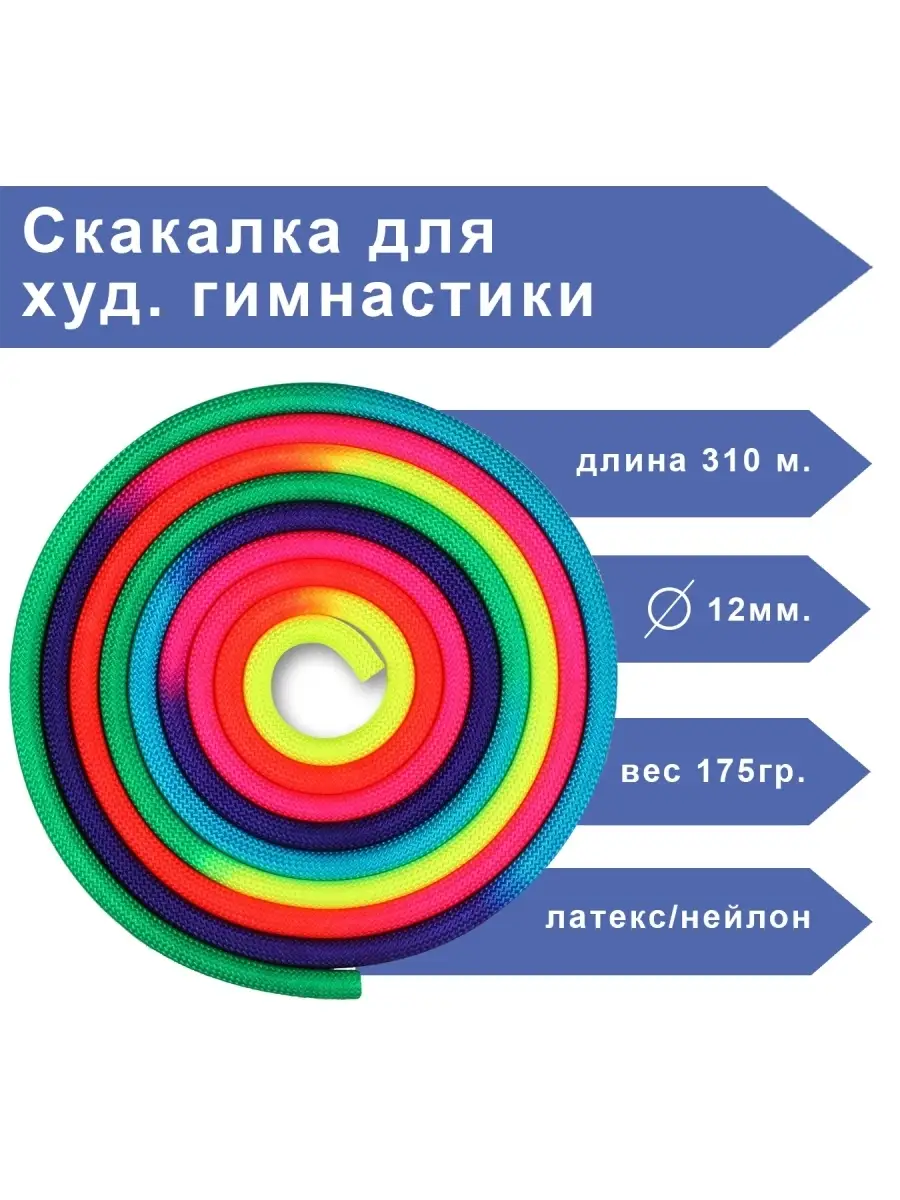 Гимнастическая скакалка представляет собой спортивный снаряд, который имеет вид шнура без ручек. Вместо ручек концы шнура завязываются в узел либо же обжигаются. Скакалка для фитнеса является базовым снарядом. С её помощью выполняются махи, броски, переводы, круги скакалкой и прыжки. Скакалка так же используется в занятиях художественной гимнастикой. Основные правила ухода:- не рекомендуем стирать спортивный снаряд;- избавляйтесь от пота на скакалке сразу после тренировки;- не храните скакалку долго в месте повышенной влажности;- промокшую от воды или пота гимнастическую скакалку вытирайте кусочком сухой ткани;- сушите скакалку в тени;- храните снаряд для художественной гимнастики в сухом месте;- для транспортировки используйте чехол или рюкзак.Длина 310 м.